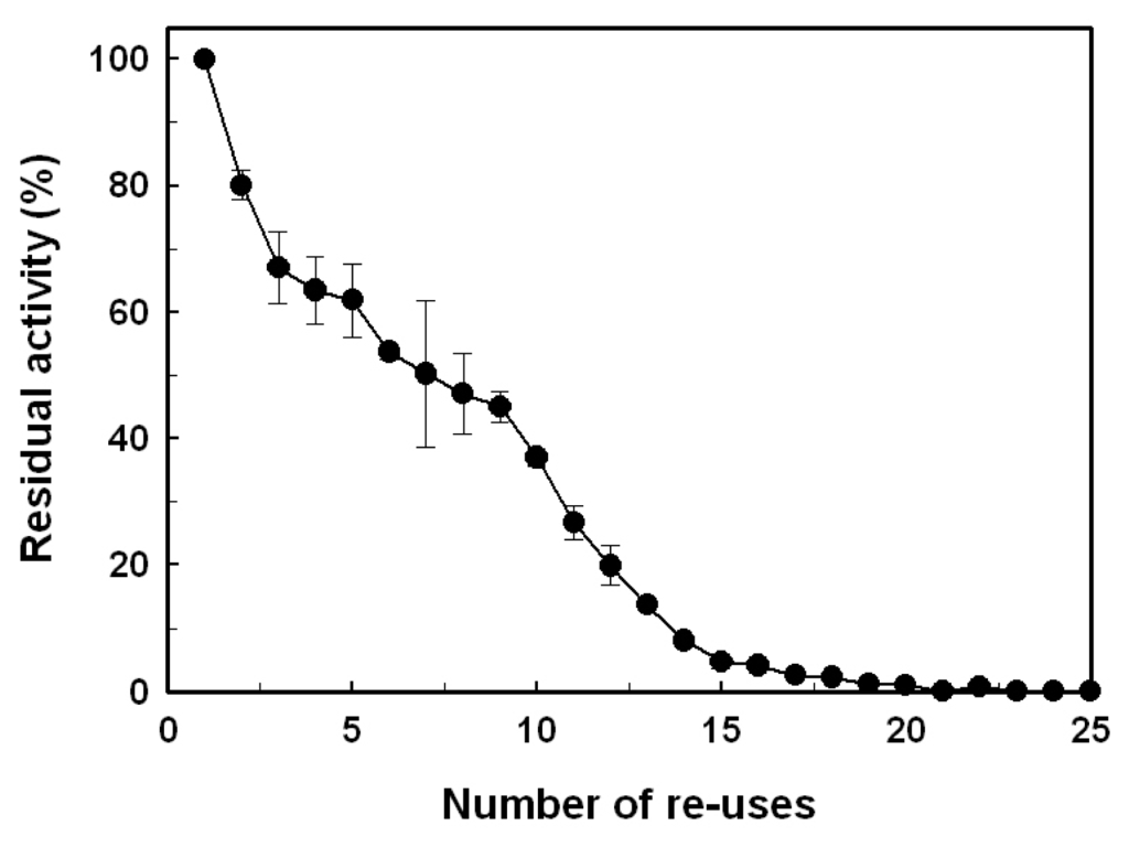 3.7. Reusability of the Immobilized Enzyme