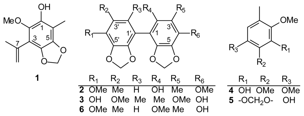 Antrodia camphorata Wu, Ryvarden and Chang (synonym: Ganoderma camphoratum, Antrodia cinnamomea, Taiwanofungus camphoratus) (Polyporaceae) is a parasitic fungus on the inner wall of the heartwood of Cinnamomun kanehiria Hay (Lauraceae). The fruiting bodies of A. camphorata are called “chang-chih” or “niu-chang-chih” in Taiwan. Traditionally, the fungus has been used for the treatment of food and drug intoxication, diarrhea, abdominal pain, hypertension and liver cancer [1]. The components of this fungus have shown activities of anti-inflammation [2–12], immune-modulation [13], anti-Helicobacter pylori[14], neuroprotection from Aβ damage [15], anti-hepatitis-B virus [16,17] and anticancer [18–31]. Here, we present the result of chemical studies from a mixture of the fruiting body and mycelia of wood cultures of A. camphorata and three new benzenoids, 3-isopropenyl-2-methoxy-6-methyl-4,5-methylenedioxyphenol (1), 2-hydroxy-4,4′- dimethoxy-3,3′-dimethyl-5,6,5′,6′-bimethylenedioxybiphenyl (2), 4,4′-dihydroxy-3,3′-dimethoxy-2,2′- dimethyl-5,6,5′,6′-bimethylenedioxybiphenyl (3) together with two known benzenoids, 2,3,6-trimethoxy-5-methylphenol (4) and 2,3-methylenedioxy-4-methoxy-5-methylphenol (5) (Figure 1), which were isolated and elucidated.