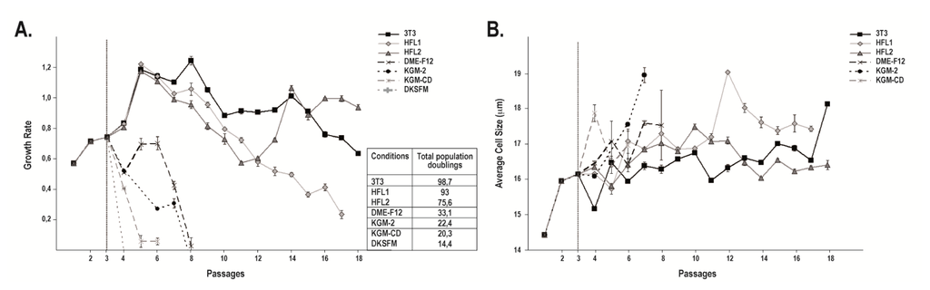 Given that the keratinocyte cell size increases upon terminal differentiation [23], the average cell size was analyzed for the whole population at each passage for every condition. On average, the cell size increased a few passages before the cells underwent their final passage (Figure 1B). One exception was noted when the average size of keratinocytes grown on the first human feeder layer (iHFL1) suddenly increased at passage 12 but stopped growing only 5 passages later, at passage 17.