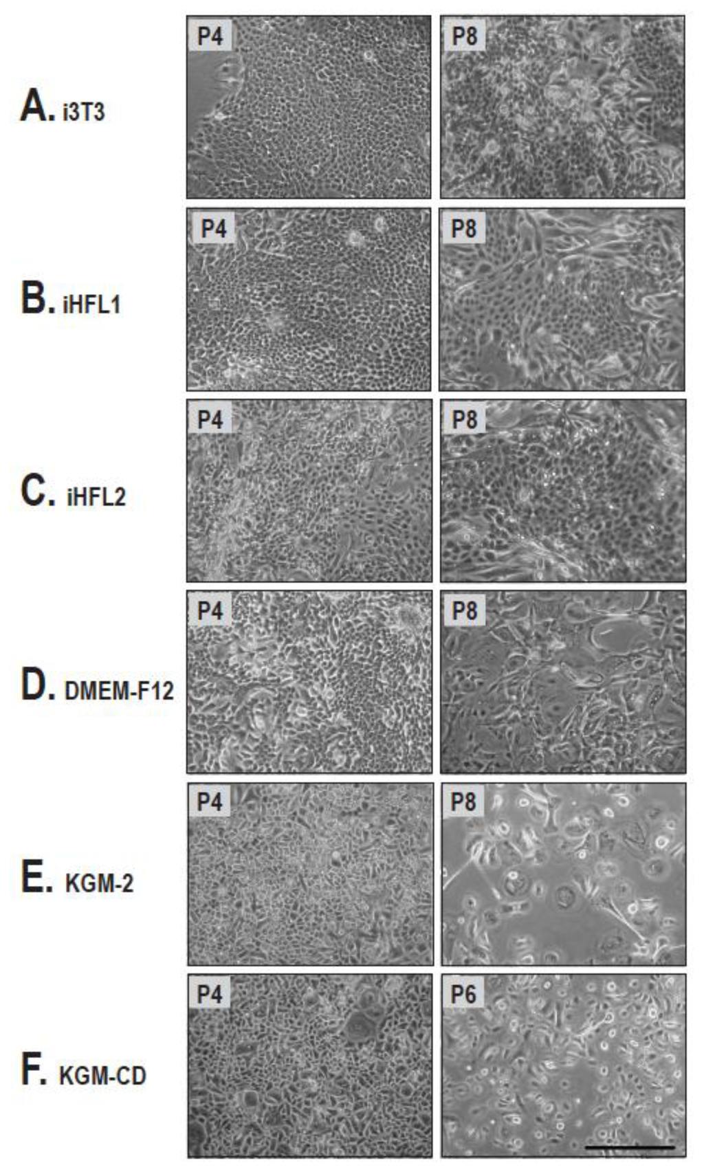 Keratinocytes morphology over culture passages. (A–C) General morphology of keratinocytes (Kfl57) grown with i3T3 (A), iHFL1 (B), iHFL2 (C) feeder layers or without (D–F) feeder layer in DME-F12 (A–D), KGM-2 (E) and KGM-CD (F) as observed under phase contrast microscopy. Note that at early passages (left column), cultures contained uniformly small keratinocytes with a high nucleus to cytoplasm ratio typical of less differentiated epithelial cells compared with more advanced passages (right column). Note that without feeder layers (D–F) keratinocytes presenting a differentiated morphology emerged rapidly over passages. Bar = 350 μm.