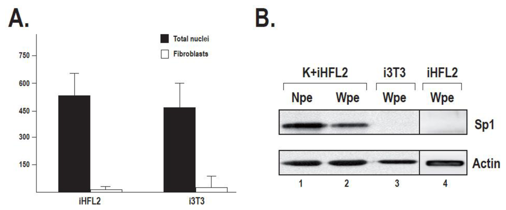 Fibroblast proportion in near confluence keratinocyte cultures and Sp1 expression in fibroblasts. (A) Number of vimentin-expressing fibroblasts compared with total nuclei count in keratinocytes cultured with iHFL2 or i3T3. (B) Expression of Sp1 was monitored by Western blot on 40 μg nuclear (lane 1, Npe) or whole cell protein extracts (lane 2, Wpe) from keratinocytes grown with iHFL2 (K + iHFL2) at near-confluence, 20 μg whole cell protein extract from i3T3 (lane 3) and 4 μg whole cell protein extract from iHFL2 (lane 4). The 4- and 20-μg protein extracts prepared from either iHFL2 or i3T3 are respectively twice and five times more than that of fibroblast proteins estimated in the 40 μg whole keratinocyte/feeder layer protein extracts. Note that no Sp1 protein is detectable in feeder layer cells, indicating that fibroblasts contribution to the Sp1 expression signal in near-confluence keratinocyte culture extracts is negligible.