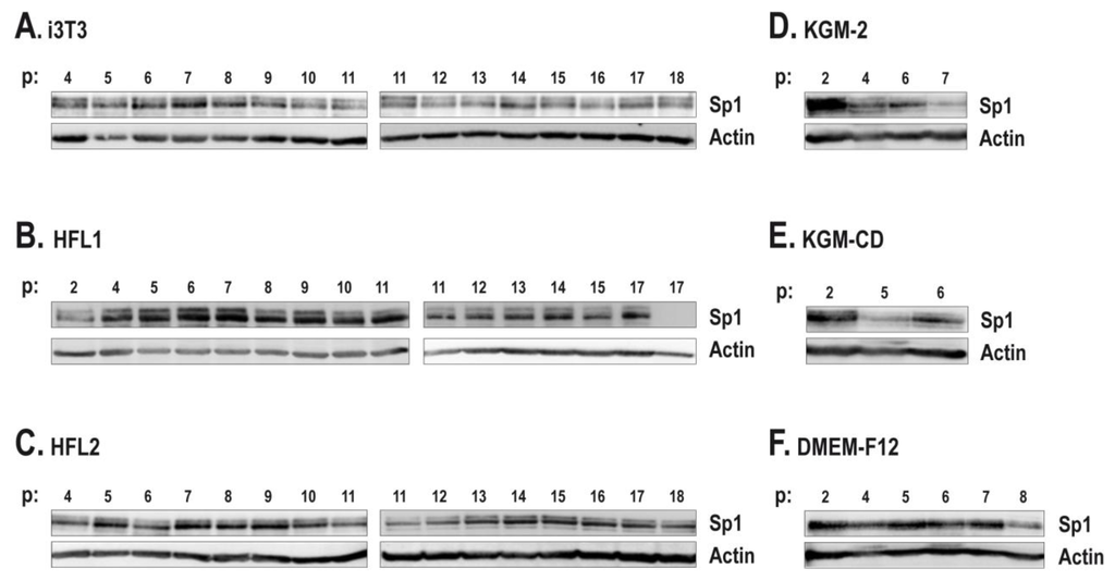 Western blot analysis of Sp1 expression level for each condition and each passage. The level of Sp1 expression was analyzed using whole cell protein extracts (40 μg). Expression levels were analyzed for keratinocytes (Kfl57) cultured with i3T3 (A), iHFL1 (B) or iHFL2 (C) feeder layers, or without feeder layer in KGM-2 (D), KGM-CD (E) or DME-F12 (F). Although the KGM-2 condition (D) entered terminal differentiation at passage 8, not enough proteins were collected and therefore no Sp1 expression analysis was conducted at this passage. For every condition, the level of actin expression was monitored for normalization purpose.