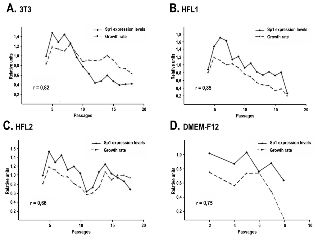 Correlation between cellular growth rate and densitometric analysis of Sp1 expression levels. Densitometric analysis was performed on Western blotted Sp1. Sp1 values were normalized by a densitometric analysis of actin expression levels. Sp1 expression levels are expressed in relative units for comparison purpose. Growth rate data are the same as those presented in Figure 1. “r” represents Pearson’s correlation coefficient.