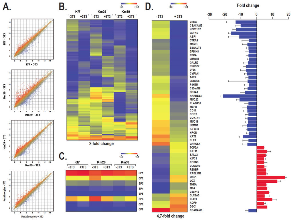 Data from gene expression profiling by microarrays. (A) Scatter plots of log2 of signal intensity from 48,804 probes for different targets covering the entire human transcriptome of keratinocytes (Kf7, Km29 and Km39) grown with (+3T3; x-axis) or without (-3T3; y-axis) i3T3. The two-fold change in intensity lines are shown in green. The scatter plot at the bottom of panel A shows the average of the signals yielded by each keratinocyte cell strain grown with (keratinocytes + 3T3) or without (keratinocytes-3T3) a feeder layer. (B) Heatmap representation of genes whose expression is differentially regulated by at least 2-fold in keratinocytes grown with a feeder layer (Kf7 + 3T3, Km29 + 3T3 and Km39 + 3T3) against keratinocytes grown alone (Kf7-3T3, Km29-3T3 and Km39-3T3). (C) Heat map representation of the transcription factors Sp1 to Sp8 expressed by keratinocytes grown with a feeder layer (Kf7 + 3T3, Km29 + 3T3 and Km39 + 3T3) against keratinocytes grown in the absence of i3T3 (Kf7-3T3, Km29-3T3 and Km39-3T3), as determined by microarrays. (D) Left: Heatmap representation of genes whose expression is modified by at least 4.7-fold in keratinocytes grown with a feeder layer (Keratinocytes + 3T3: corresponds to the average of the signals from each individual cell-strain grown with i3T3) against keratinocytes grown alone (keratinocytes-3T3: corresponds to the average of the signals from each individual cell-strain grown without i3T3). Right: graphical representation of the linear fold changes for each of the 52 genes appearing on the heatmap. Blue: repressed genes; red: activated genes.