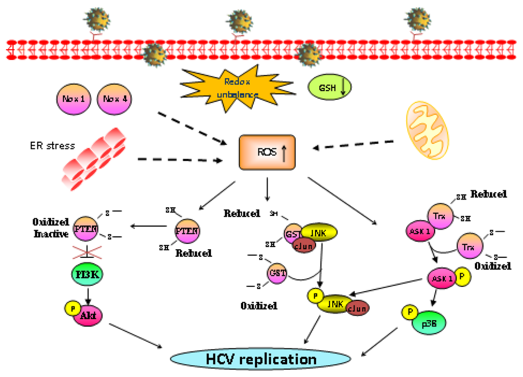 Schematic representation of ROS sources during Hepatitis C virus (HCV) infection and redox mechanisms for activation of MAPKs and PI3K/Akt.