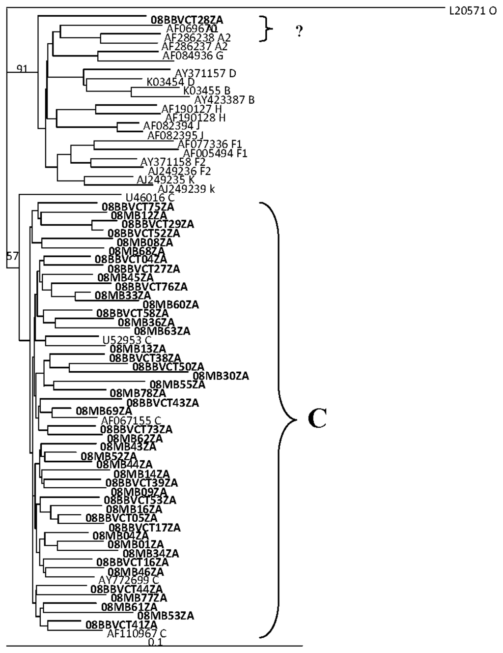 Phlyogenetic analysis of the sequences showed that 88/89 (99%) of the viruses were HIV-1 subtype C without clonal providence. One virus (08BBVCT28ZA) could not be assigned by phylogenetic analysis (See Figure 1). The sequence was assigned as subtype F in the Stanford drug resistance analysis.