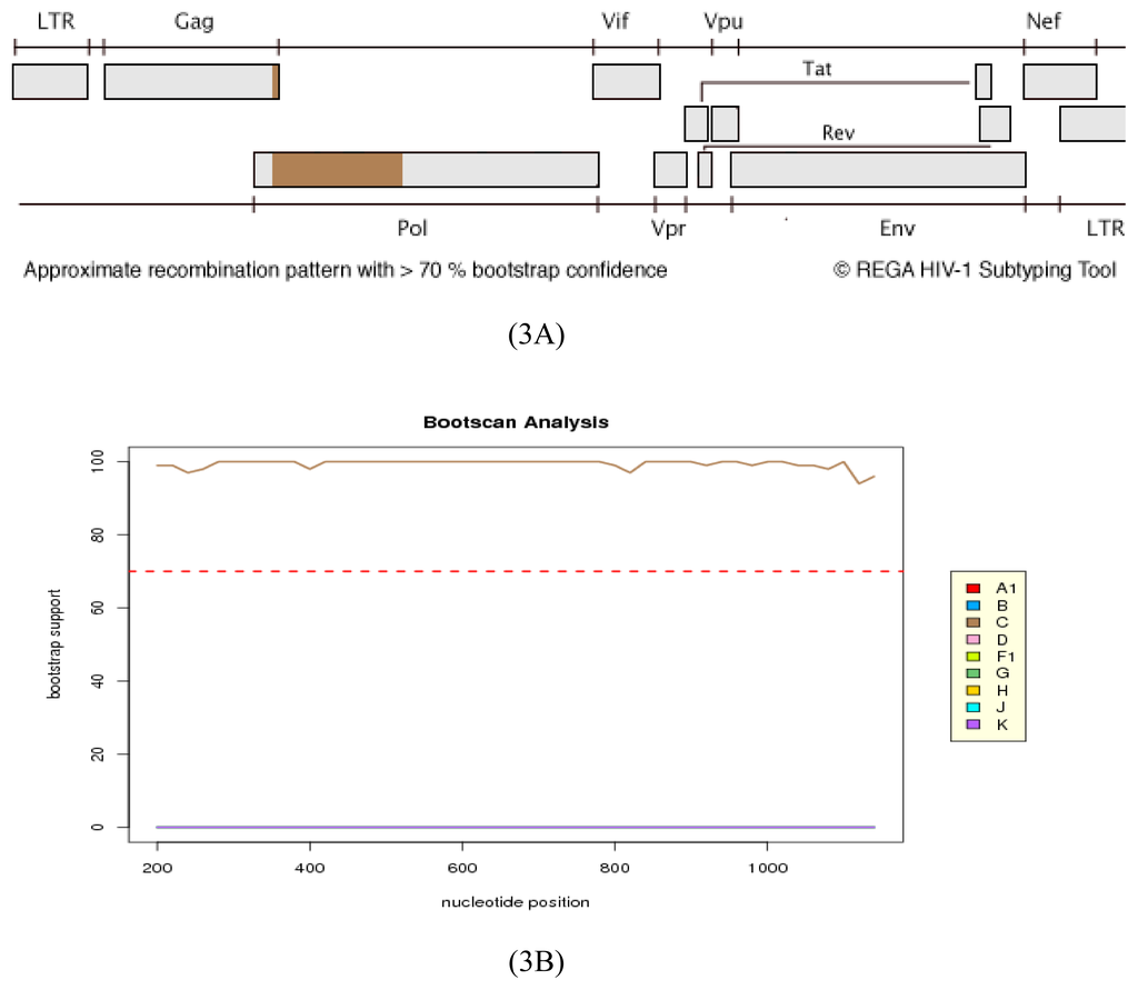 Recombination analysis of 08BBVCT28ZA protease/reverse transcriptase sequence. In 3A & 3B, sequence assignment and bootscanning of the sequence (1127 bp, HXB2:2253–3379) using REGA shows that the sequence is HIV-1 subtype C with a high bootstrap support.