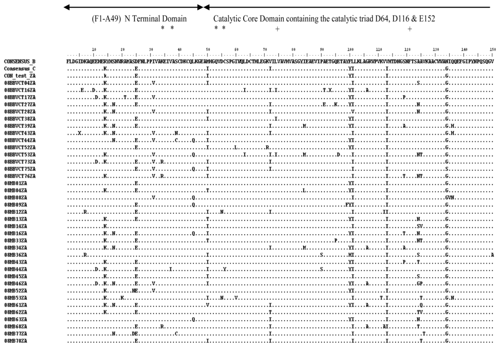 Alignment of amino acid residues of HIV-1 subtype C (residues 1–150). The consensus was generated from 37 viruses. The global subtype B and C consensuses were obtained also from HIV sequence database. The entire consensus sequences were aligned using BioEdit software. The conserved residues in the HHCC motif (*) and the DDE (+) are noted. All positions that agree with the global subtype B consensus sequence are denoted by a dot (.); while ambiguous amino acids are denoted by an X. The test consensus was identical to the global subtype C consensus, except at two positions (V72I and R269K). It differed from the global subtype B consensus at 10 positions (R14K, D25E, M50I, F100Y, L101I, V113I, N134G, E167D, T218I and D278A).
