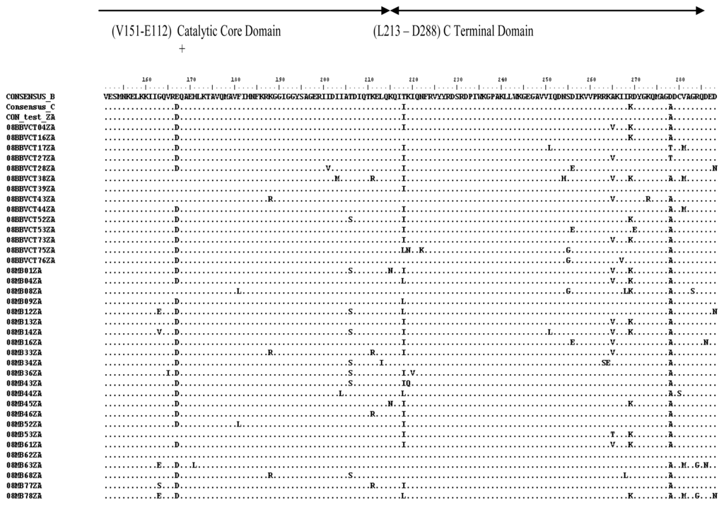 Alignment of amino acid residues of HIV-1 subtype C (residues 151–288). The test consensus was generated from 37 viruses. The global subtype B and C consensus sequences were obtained also from HIV sequence database. The conserved residue E, which is an integral part of the DDE motif is noted (+). All positions that agree with the global subtype B consensus sequence are denoted by a dot (.); while ambiguous amino acids are denoted by an X.