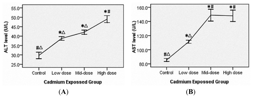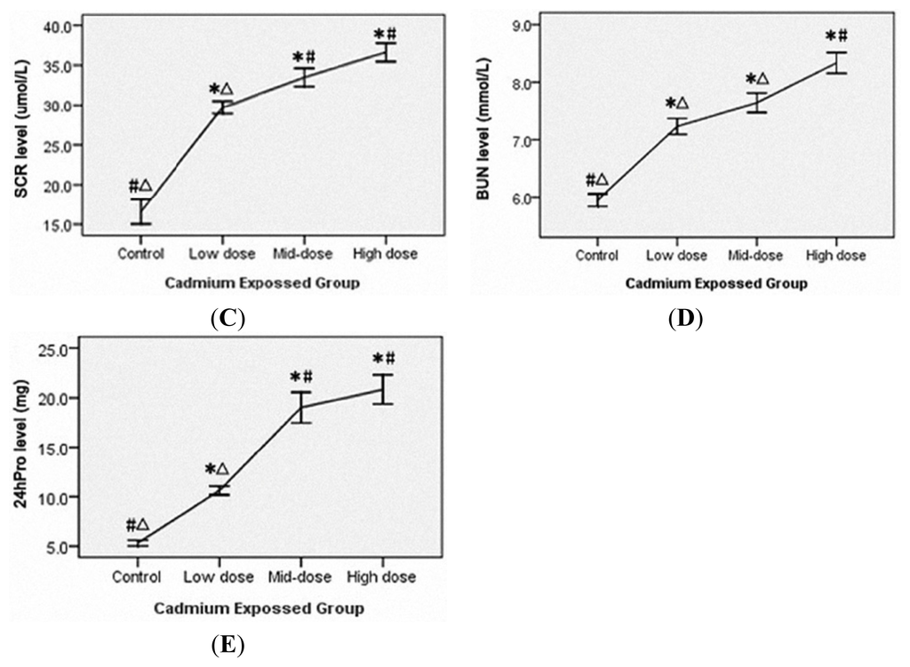 Serum ALT and AST levels were used as liver function indicators and a dose-dependent elevation was observed in the cadmium-exposed rats (p < 0.05) (Figure 1A,B). In addition, BUN, SCR and 24hPro were used as the renal function biochemical indicators and a dose-dependent increase was also observed (p < 0.05) (Figure 1C–E).