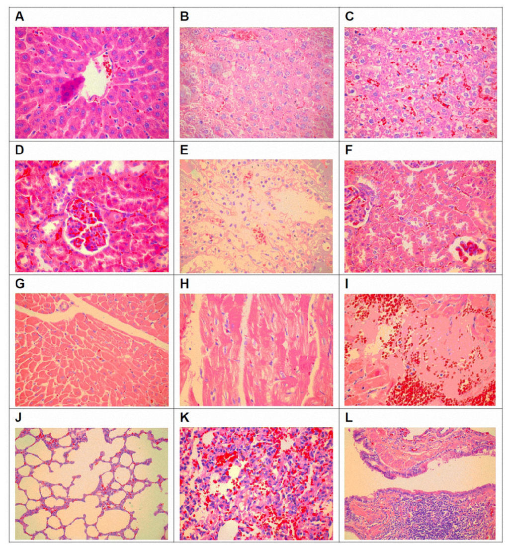 Representative pathological changes (HE staining, ×400) of liver (A–C), kidney (D–F), heart (G–I) and lung (J–L) in rats from the control group (A,D,G,J), the low cadmium exposure group (B,E,H,K) and the high cadmium exposure group (C,F,I,L).