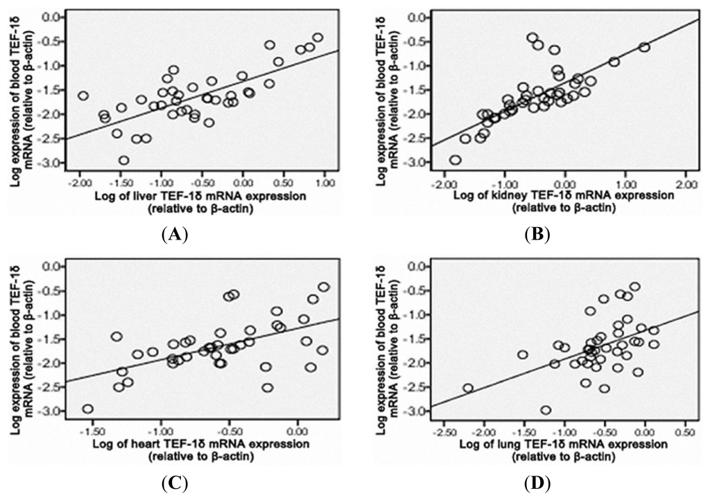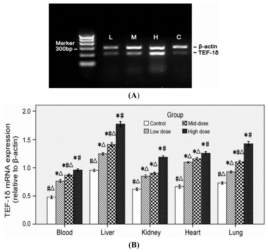 A dose-dependent increase of the TEF-1δ mRNA expression levels was indicated in blood and all the measured organs (liver, kidney, heart and lung) in all cadmium exposed groups (p < 0.05) (Figure 3A,B). The increased expression of TEF-1δ in cadmium-exposed rats was further confirmed by FQ-PCR. As shown in Table 5, significant up-regulated TEF-1δ mRNA levels were found in all the detected organs in cadmium-exposed rats. Additionally, an obvious cadmium dose-dependent increase of the TEF-1δ expression level was observed in all tested organs among different cadmium-exposed rats (p < 0.05).