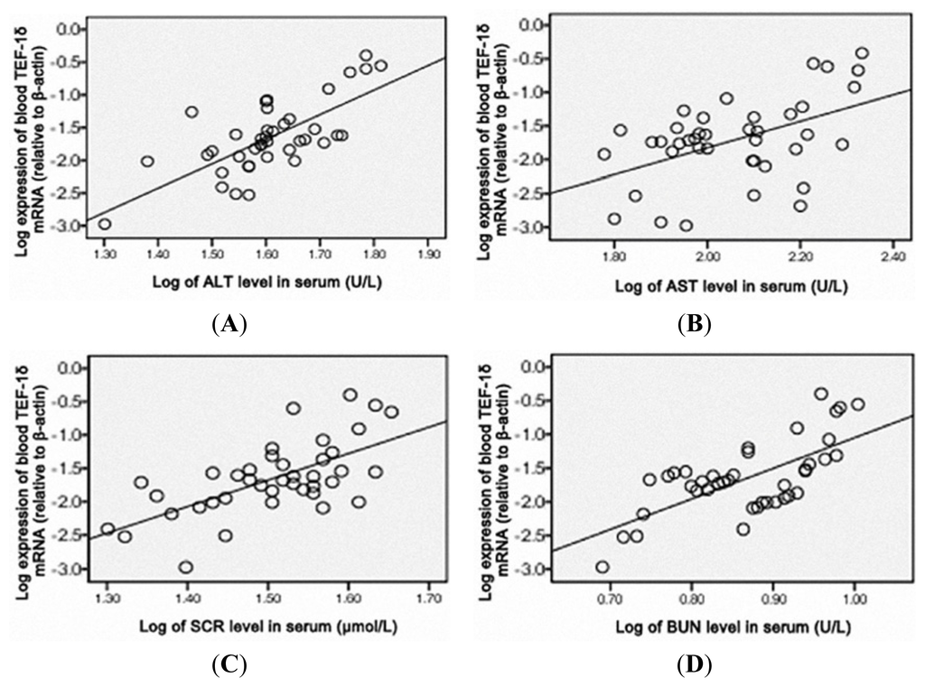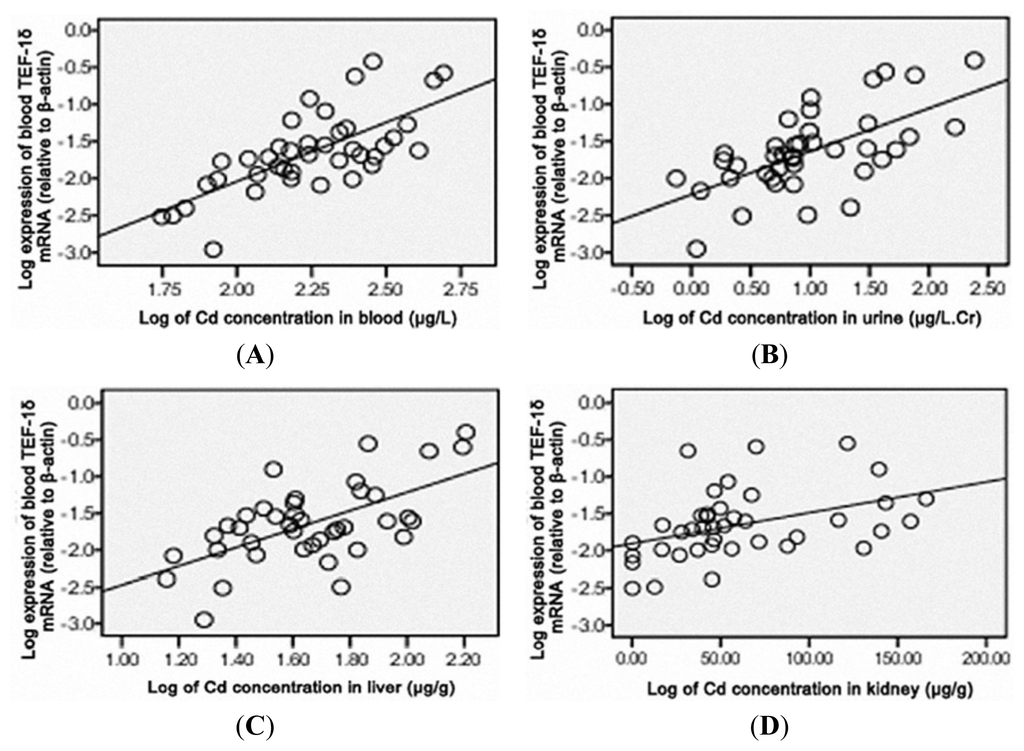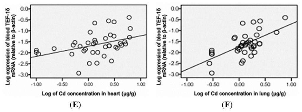 Translation elongation factors (TEFs) constitute a group of nucleotide exchange proteins that are required for the elongation step of translation. TEFs also have non-canonical functions unrelated to protein synthesis []. Increasing evidence has shown that translation factors participated in the control of cell proliferation, suggesting that these factors may serve as therapeutic targets for cancer [,]. It has been shown that increased expression of TEF1A1 and TEF1A2 proteins were associated with increased cell proliferation, oncogenic transformation, and delayed cell senescence [,]. It is well established that cadmium exerts multiple toxicities by affecting cell proliferation, differentiation, apoptosis and other cellular activities through modulation of gene expression by activation of transcription and translation factors [,–]. Our previous work also demonstrated that the DNA repair genes’ epigenetic mechanisms responsible for carcinogens are due to cadmium []. In the present study, the blood level of TEF-1δ in cadmium-induced rats showed very well positive correlation to the cadmium levels in major organs and the damage degree of these organs, suggesting that blood TEF-1δ can reflect the accumulation of cadmium in major organs and the organ damage. TEF-1δ expression level in blood is useful in predicting the cadmium-induced toxicity. Taken together, our study firstly identified that blood TEF-1δ is a novel valuable biomarker of cadmium exposure and organ toxicity of cadmium. It may be a significant biomarker for field investigations and risk assessment for humans, which are exposed to occupational and environmental cadmium.