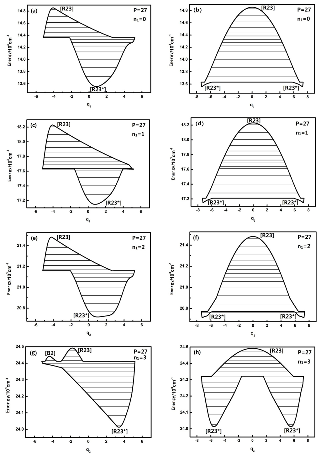 The qualitatively different quantum number n1 of the HOBr system corresponding to dynamical potentials and characteristics are discussed in the previous section. Next we will discuss quantitatively the dynamical potentials of the specific P numbers with the analysis of the phase space trajectories and the action integral of every energy level. For instance, the dynamical potentials of HOBr with P = 27 are shown in Figure 3a,b in q2 and q3 coordinates, where the horizontal lines show the energy levels sharing the designated P. The reason why the case of P = 27 is singled out for discussion is that this case is quite representative and possesses the most fruitful characteristics. The dynamic potentials obtained when n1 is equal to three are as follows: