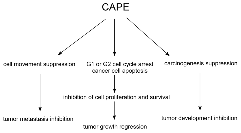 Effects of CAPE treatment on human cancer cells. Treating human cancer cells with CAPE causes suppression of carcinogenesis, cell cycle progression, and cell movement. CAPE also stimulates apoptosis in cancer cells. These changes then give rise to the inhibition of development, growth, and metastasis of tumors.