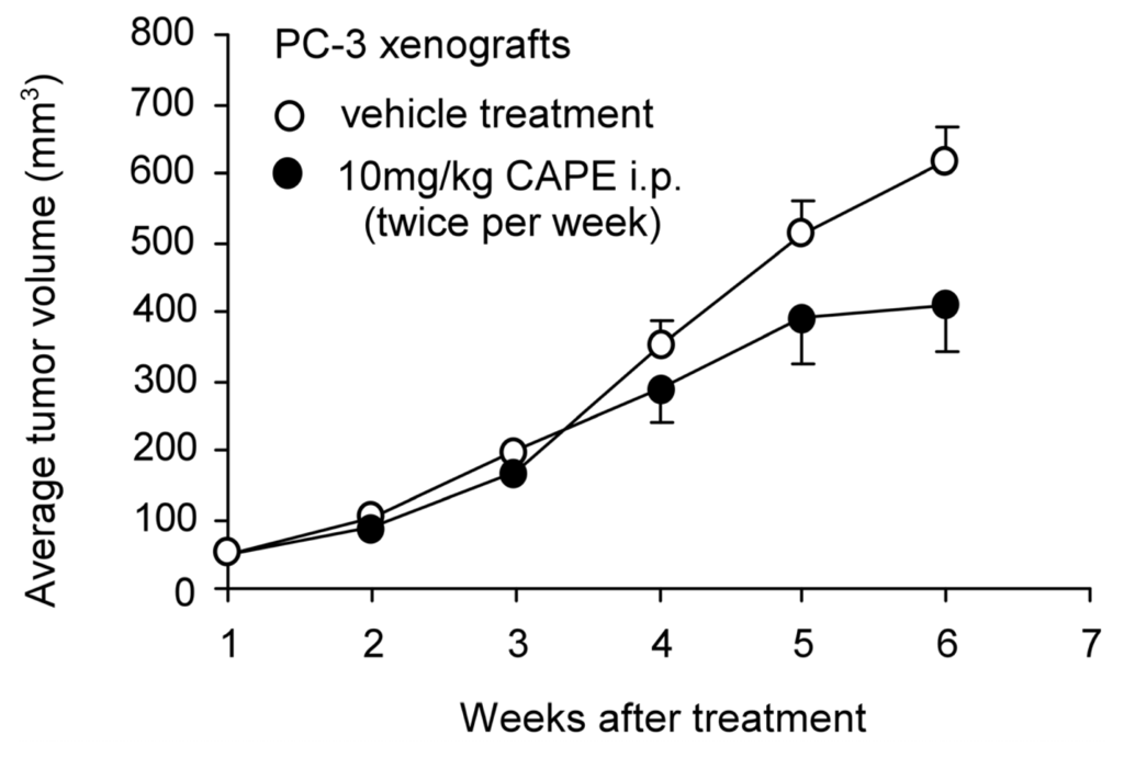 Our previous studies suggested that the proliferation of LNCaP 104-S, DU-145, and PC-3 human prostate cancer cells was dosage-dependently suppressed by CAPE treatment (IC50 0.68 μM, 9.54 μM, and 18.65 μM, respectively) [70,71]. LNCaP 104-S is an androgen-dependent subline isolated from LNCaP FGC which is very sensitive to androgen treatment [103–105]. The growth inhibitory effects of CAPE treatment on LNCaP 104-S and PC-3 cells happened within 24 h following CAPE treatment and accumulated over time [70,71]. Treatment with 10 μM CAPE significantly inhibited the formation of LNCaP 104-S and PC-3 colonies in soft agar [70,71]. Flow cytometric analysis revealed that treatment with 3 μM to 20 μM CAPE reduced S phase cell population and caused G1 cell cycle arrest in LNCaP 104-S and PC-3 cells [70,71]. CAPE treatment at high concentrations (88 μM to 176 μM) induced apoptosis in PC-3 cells [72]. Administration of CAPE by gavage (10 mg/kg body weight per day) for six weeks resulted in 50% reduction of LNCaP 104-S xenografts tumor volume in nude mice (p = 0.0008) [70]. Intraperitoneal injection (i.p.) of CAPE (10 mg/kg body weight per day) twice a week for 5 weeks reduced 33% of PC-3 xenografts tumor volume in nude mice (p < 0.05, unpublished data, Figure 3).