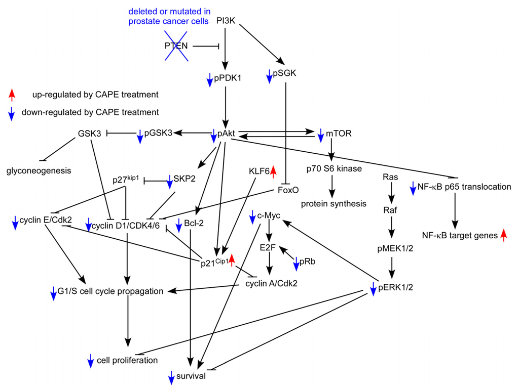 Putative model of anti-cancer effect of CAPE in human prostate cancer cells. Protein abundance or activity being stimulated by CAPE treatment are labeled with red upward arrows, while those being suppressed by CAPE treatment are labeled with blue downward arrows.