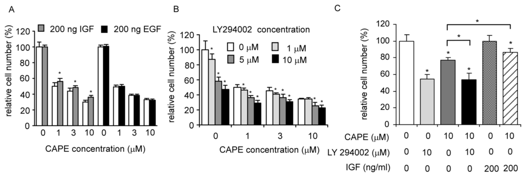 CAPE treatment targets PI3K/Akt signaling pathway. (A) LNCaP 104-S cells were treated with 0, 1, 3, or 10 μM CAPE in the presence and absence of 200 ng IGF-1 or 200 ng EGF for 96 h; (B) LNCaP 104-S cells was treated with CAPE (0, 1, 3, or 10 μM) and LY294002 (0, 1, 5, or 10 μM) for 96 h; (C) PC-3 cells was treated with different combinations of CAPE (10 μM), LY294002 (10 μM), and IGF-1 (200 ng/mL) for 72 h. Cell number was determined by 96-well proliferation assay. (*) represents statistically significant difference (p < 0.05) between the groups treated with IGF-1 or LY294002 compared to the control without IGF-1 or LY294002 treatment at each concentration of CAPE.