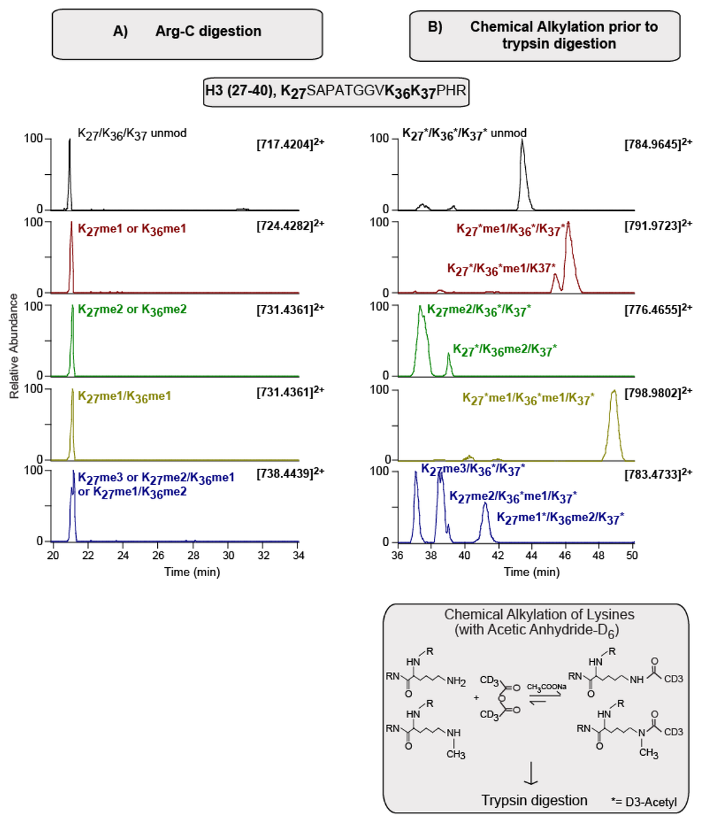 Moreover, this derivatization labels unmodified and mono-methylated Lysines with a deuterated acetyl moiety (showing a delta mass of 45.0294 Da) but does not react with di-methyl, tri-methyl and acetyl Lysines, enabling the distinction between isobaric modification-bearing peptides. For example, peptide H3 (27–40) contains three Lysines, which can be differentially modified. In a case where two of these Lysines are mono-methylated, it is challenging to distinguish this species from an isobaric peptide containing a single di-methylation modification (Figure 1A). The derivatization approach however removes this isobaric feature (Figure 1B), since the addition of the deuterated acetyl moiety to unmodified and mono-methylated Lysines leads to a mass difference between the two-peptide isoforms. Furthermore, the peptides modified by distinct combinations of native and chemical modifications, display slightly different elution times, which contributes to the unambiguous assignment of modifications to specific residues.
