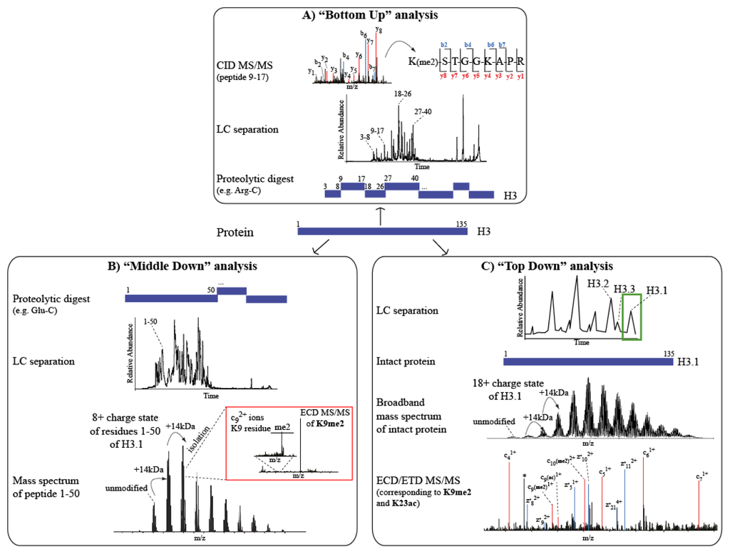 Detecting the combinatorial aspect of the histone code, however, remains a daunting task. The “Bottom Up” approach is efficient for amino acid sequencing and improved throughput for complex samples, however, it offers only a partial view of the complex cross-talks occurring among different hPTMs. In this respect, advances in “Middle Down” and “Top Down” approaches suggest that only a combination of the three MS approaches will provide the comprehensive solution to crack the histone code. At present however two major limitations limit the applicability of protein–centric approaches: first, the lack of straightforward “Middle Down” or “Top Down” analytical workflows, from sample preparation and protein separation, to MS detection and data processing, compatible with large-scale analyses; secondly, the bioinformatics tools available do not effectively handle the higher complexity of tandem mass spectra.