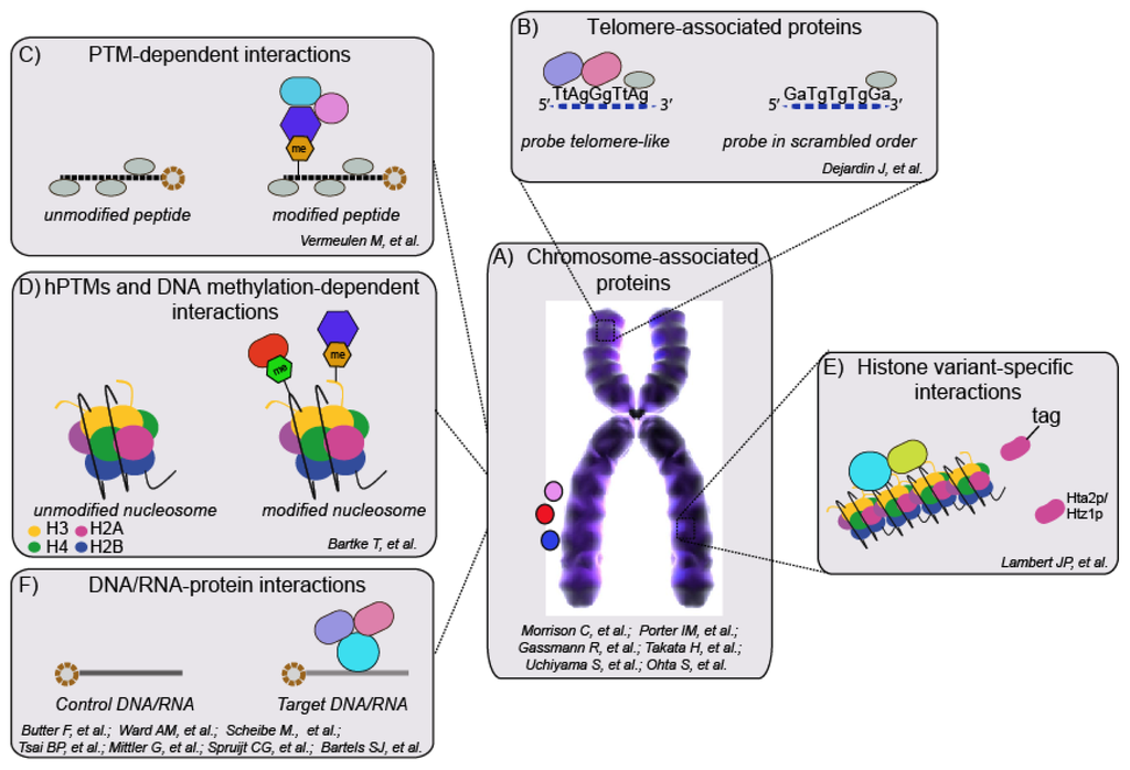 Different biochemical approaches for the proteomic characterization of chromatin architecture. (A) Some strategies address the chromosome as a whole, whereas others focus on the characterization of specific chromatin regions: (B) telomeres, regions enriched with modifications on (C) histones or (D) DNA and (E) specific histone variants. (F) Finally, some approaches aim at characterizing protein associating to chromatin via binding to distinct RNAs molecules and/or DNAs sequences.