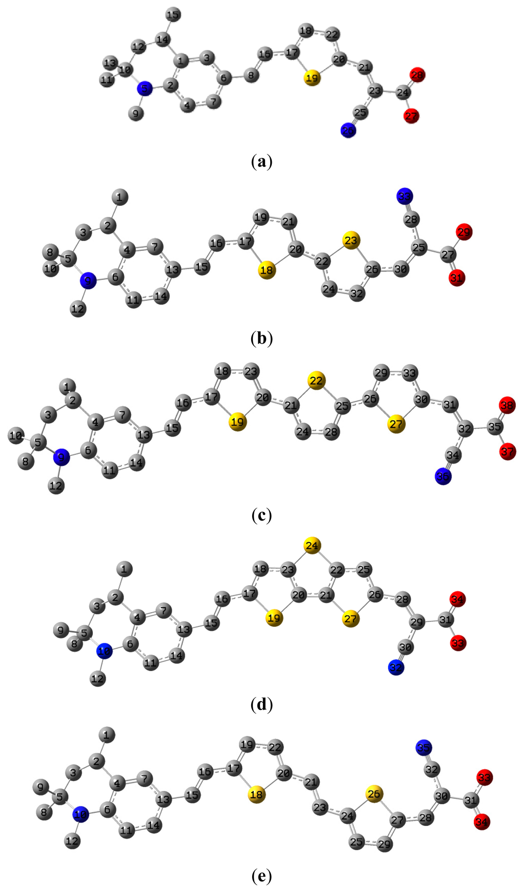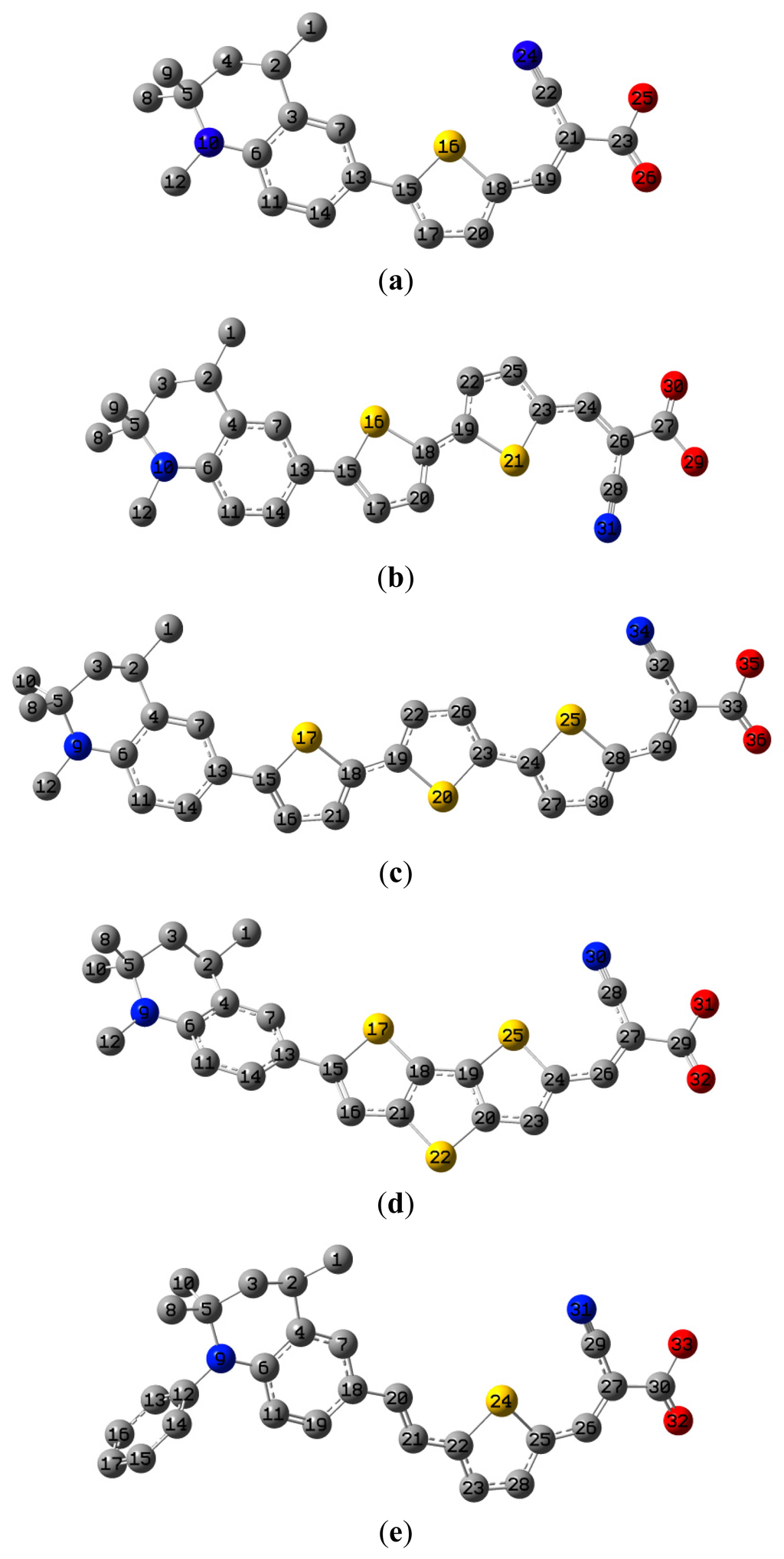 The optimized geometrical structures of dyes (a) C1-1, (b) C1-2, (c) C1-3, (d) C1-4, and (e) C1-5. (CAM-B3LYP/6-31G(d,p) in gas phase, the blue colored spheres: N; the red colored spheres: O; the yellow colored spheres: S; the other dark colored spheres: C; the hydrogen atoms have been omitted for clarity.)