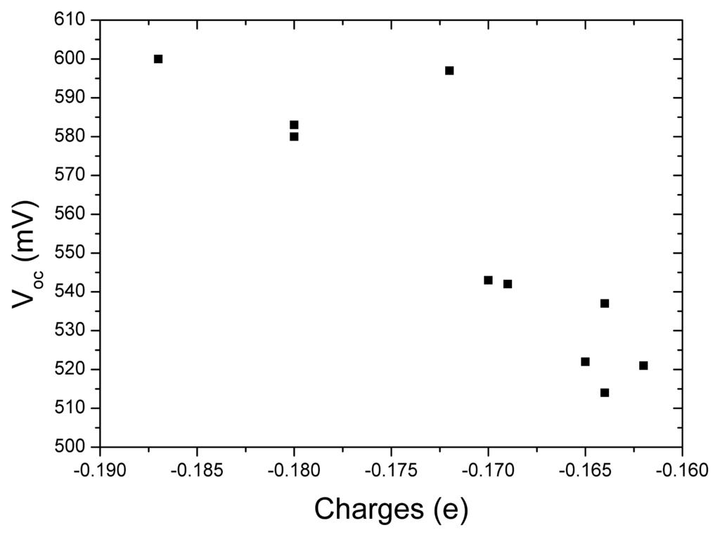 The open-circuit voltage Vocversus the charges of acceptor groups in tetrahydroquinoline dyes is presented in Figure 4 in order to investigate the relationship between these quantities. It can be found that more charges populated in acceptor groups correspond to larger Voc. This means more charges populated in acceptor are favorable to increase Voc. So, introducing strong electron-withdrawing group in acceptor of dye sensitizer is a possible way to increase Voc of DSC. This tendency is similar to our previous work for the dyes of coumarin NKX derivatives [70].