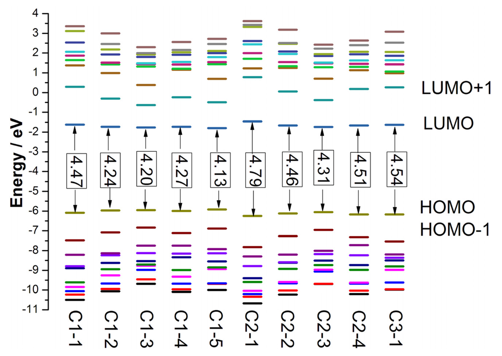 The optimized geometries of tetrahydroquinoline dyes C1-1, C1-2, C1-3, C1-4, C1-5, C2-1, C2-2, C2-3, C2-4, and C3-1 are shown in Figures 1 and 2. The selected geometrical parameters, including bond lengths, bond angles, and dihedrals are listed in Tables S1–S3 in supporting information (SI). The calculated geometrical data indicate that the geometrical parameters of same group (tetrahydroquinoline, vinylene, thienyl and dithieno[3,2-b;2′,3′-d]thienyl, etc.) in different dyes are very similar. This can be understood from the localized interaction of chemical bonds. The cyanoacrylic acid groups in the dyes are coplanar with the groups in conjugate bridge. The torsion angles among the thiophene-rings in bithiophene and dithieno-[3,2-b;2′,3′-d]thiophene groups are quite small. For instance, the torsion angle between thiophene-rings in bithiophene in C1-2 is about 1.7°. The conjugated effects, which can be enhanced by the quasi-planar structure of bridge and the coplanar character between acceptor moieties and conjugate bridges, extend the delocalization of electron, and it is favorable for efficient CT from the chromophore to the carboxyl group. Similar geometric characters are also appeared in the organic dye sensitizers JK-1 and JK-2 [63], JK-16 and JK-17 [64,65], and other organic dyes which contain cyanoacrylic acid group [66–69].
