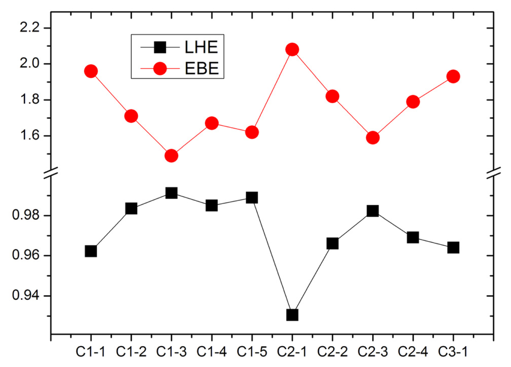 The EBE, as an important quantity for the efficiency of excitonic solar cells, determines the charge separation in solar cells [42]. The EBE can be calculated as the difference between the electronic and optical band gap energies [74]. The electronic band gap is calculated as the energy difference between the HOMO and LUMO levels, while the first excitation energy is adopted as the optical gap [42,75]. The calculated EBE (in eV) of tetrahydroquinoline dyes are shown in Figure 6. It indicates that the elongating of conjugate bridge generates the decreasing of EBE, which is favorable for photo-to-current energy conversion via the dissociation of a bound exciton (hole/electron pair). Furthermore, the smallest EBE of C1-3 and C2-3 dyes suggest the exciton can dissociate more effectively than that in other dyes. More interestingly, the figure reveals that the EBE and the LHE are inversely correlated, implying that the dyes with lower EBE produce more efficient light harvesting. This agrees with the relationship between the EBE and quantum yield [42].