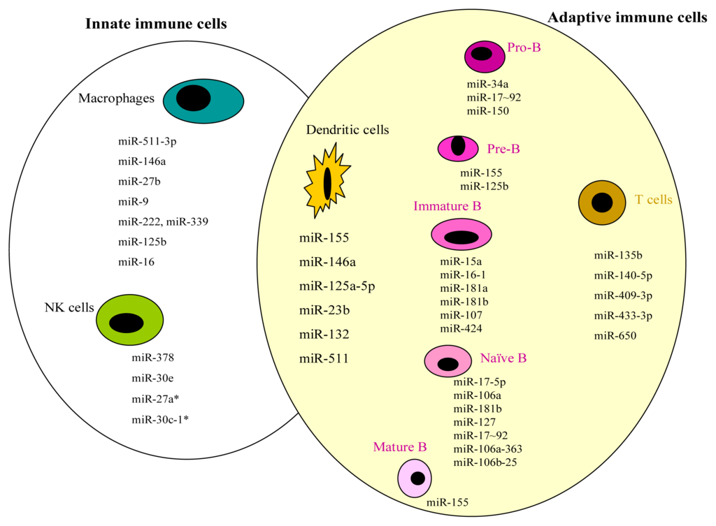 Some lineage-specific miRNAs have been found to play a key role in regulating various developmental stages of the lineage development of the two major arms and thus affect different cell types in the mature state and their progenitor counterparts [5]. miRNAs are also involved in the activation of various immune cell components and thus regulate various cancer-related inflammatory responses and cytokine signalling [6,7]. Furthermore, certain miRNAs display the important modulatory capabilities on the life span, migration and immunogenicity of immune cells. For example, research showing that harnessing these features of miRNA targeting of DCs may lead to possible DC vaccine development for future clinical trials [8]. Figure 1 forms a visible representation of the involved miRNAs in immune cells.
