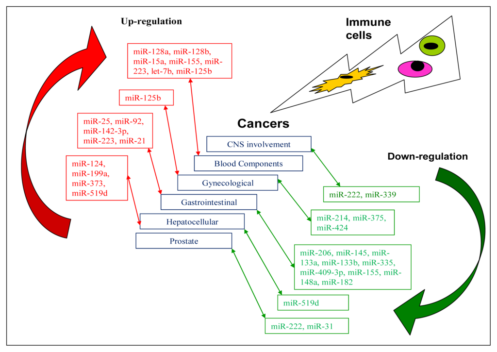 miRNAs are involved in the pathogenesis of prostate cancer, and their roles as oncogenes, tumour suppressors and metastasis regulators lead to the hope that they might be molecularly targeted as diagnostic or prognostic markers for the treatment of prostate cancer [105]. Fuse et al.[94] demonstrated that miR-222 and miR-31 inhibited cell proliferation, invasion and migration in the prostate cancer cell lines PC3 and DU145, indicating that these two miRNAs might act as tumour suppressors in prostate cancer. miR-155 is a member of oncomir class of miRNAs and implicated in a wide variety of tumours including colon cancer [95]. Figure 2 signifies the regulated miRNA expressions in various tumour types which might be therapeutically instituted in the arms of immune system.