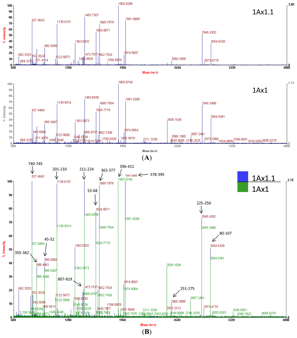 MALDI-TOF mass spectra of the two high molecular weight glutenin subunits 1Ax1 and 1Ax1.1. (A) Individual mass traces and (B) Overlaid mass traces.