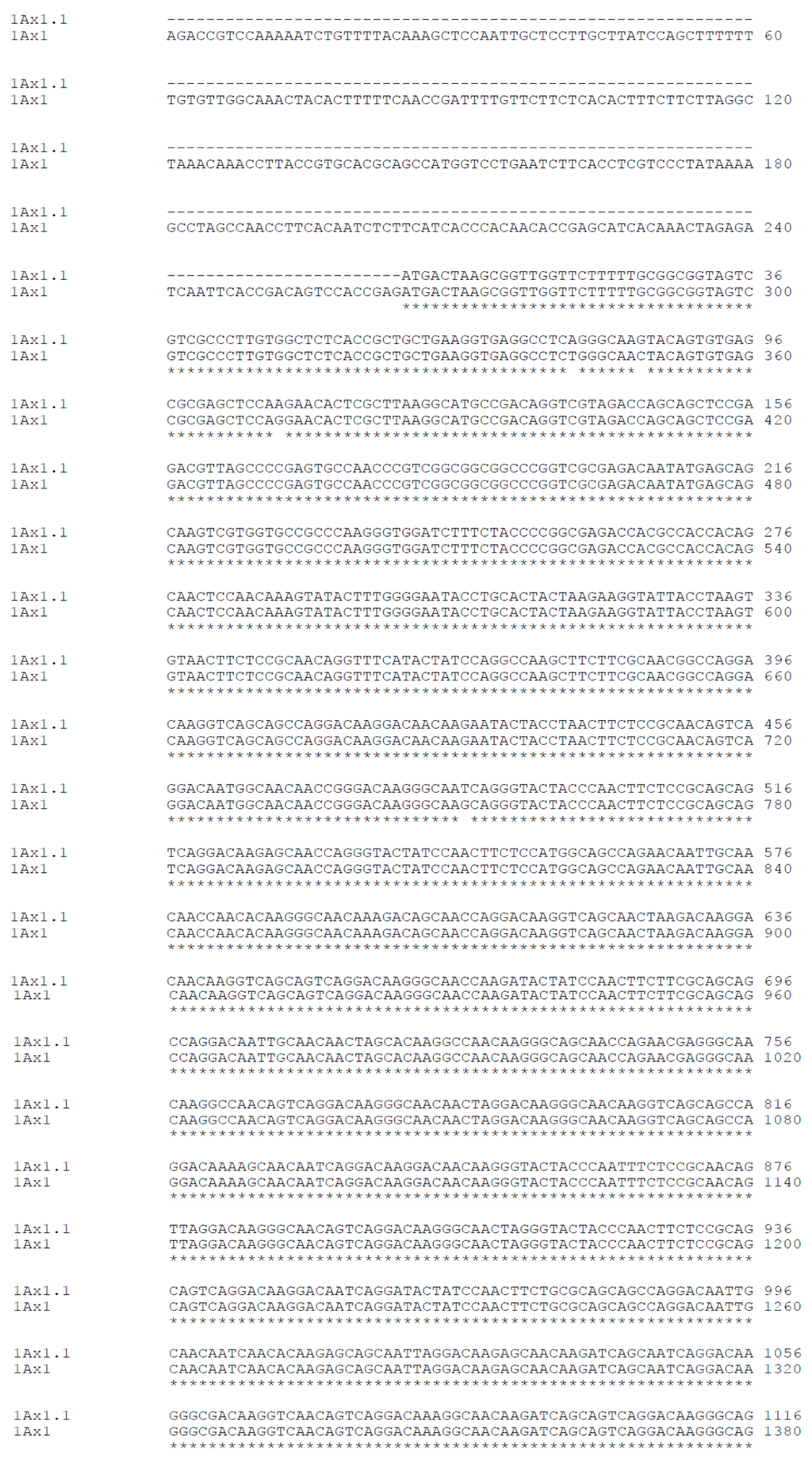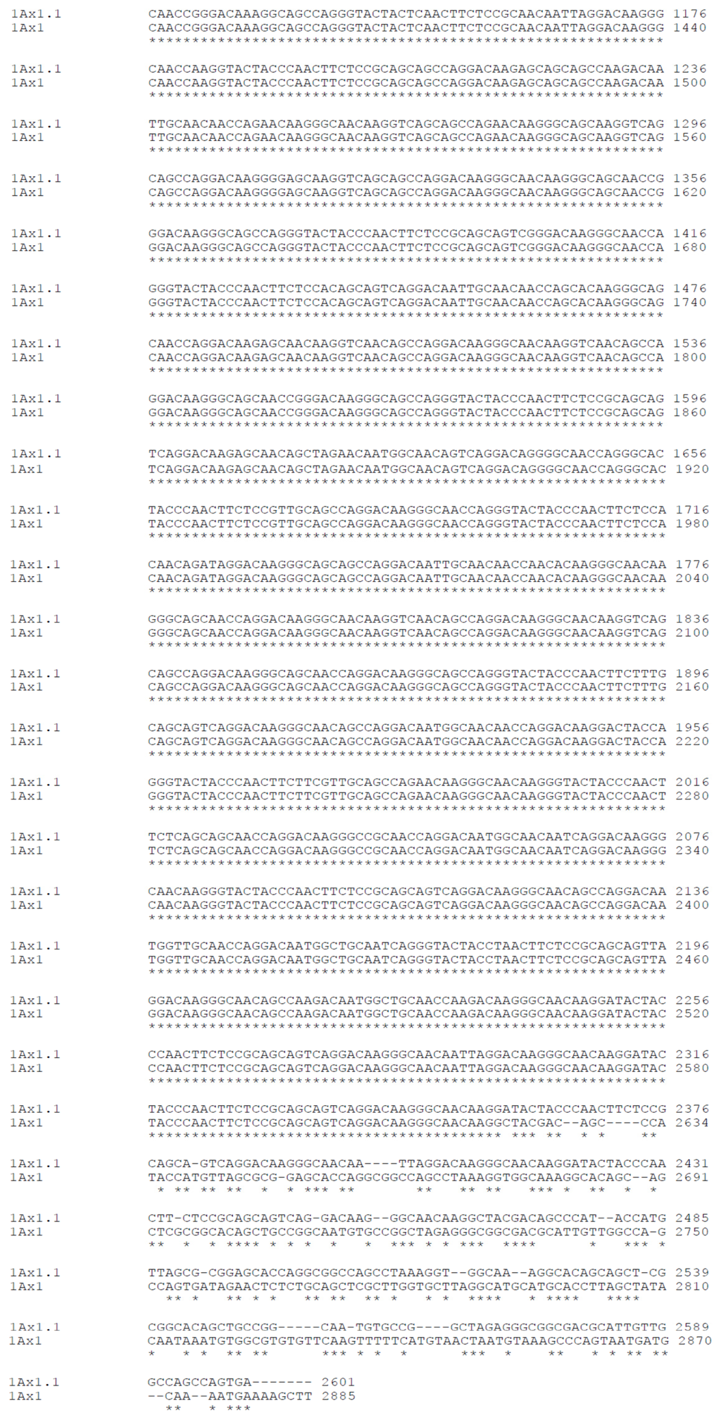 Alignment of 1Ax1.1 (GenBank® accession no. JN172932.1) and 1Ax1 (GenBank® accession no. X61009.1) HMW-GS nucleotide coding sequences. The identity between the two sequences is 95%.