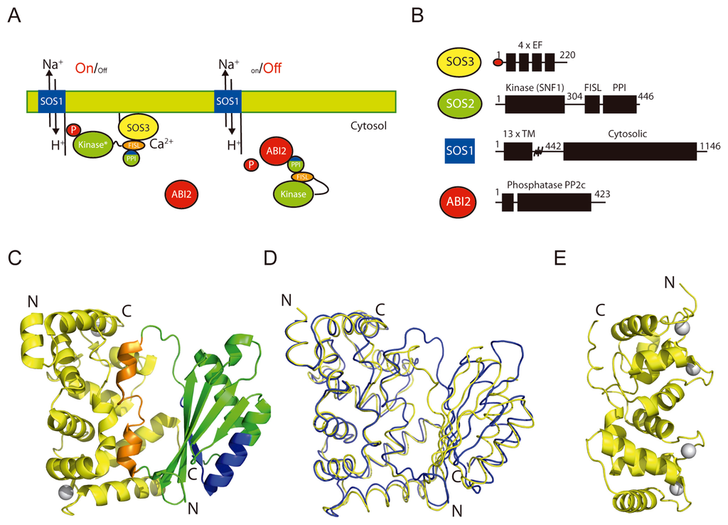 The SOS pathway is illustrative of the CBL-CIPK-PP2C network. (A) A schematic representation of the pathway function. (B) Domain structure of the protein components. (C) A ribbon representation of the structure of SOS3 in complex with the C-terminal regulatory domain of SOS2 and Ca2+. SOS3 is displayed in yellow, the FISL motif is displayed in orange, the PPI motif is displayed in blue, and the rest of the PPI domain of SOS2 is displayed in green. Calcium atoms are displayed as grey spheres. (C) The superimposition of the ribbon diagrams corresponding to the structures of the SOS3-SOS2, in blue, and CBL2-CIPK14 in yellow. (D) The structure of SOS3 in complex with Ca2+.