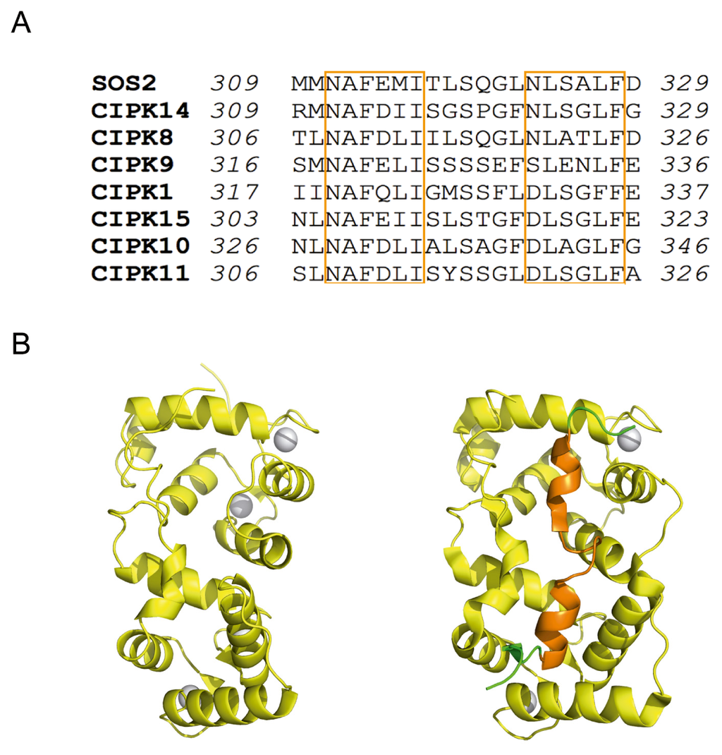 The FISL motif. (A) Sequence alignment of CIPK FISL motif. The α-helical regions have been highlighted with orange boxes. (B) Structural comparison of SOS3-Ca2+ in its free form (left) or bound to SOS2; the FISL motif is displayed in orange.