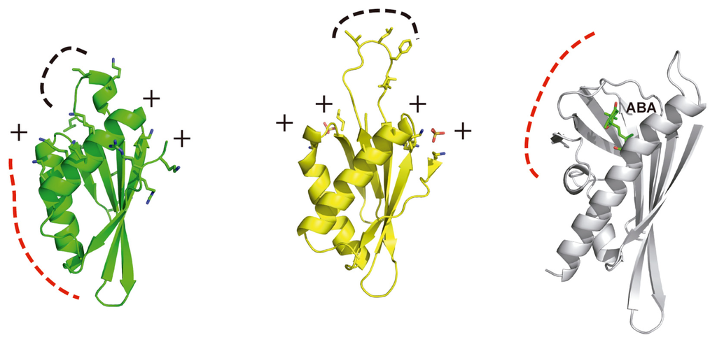 Structural comparison of SOS2 PPI domain (left) with the related structures of the KA1 lipid binding domain (middle) and PYL/PYL ABA receptors (right). Lys and Arg, as well as accessible hydrophobic residues are displayed in stick mode. The hydrophobic loop and the PP2C binding interaction area are highlighted as a black and red dashed line, respectively.