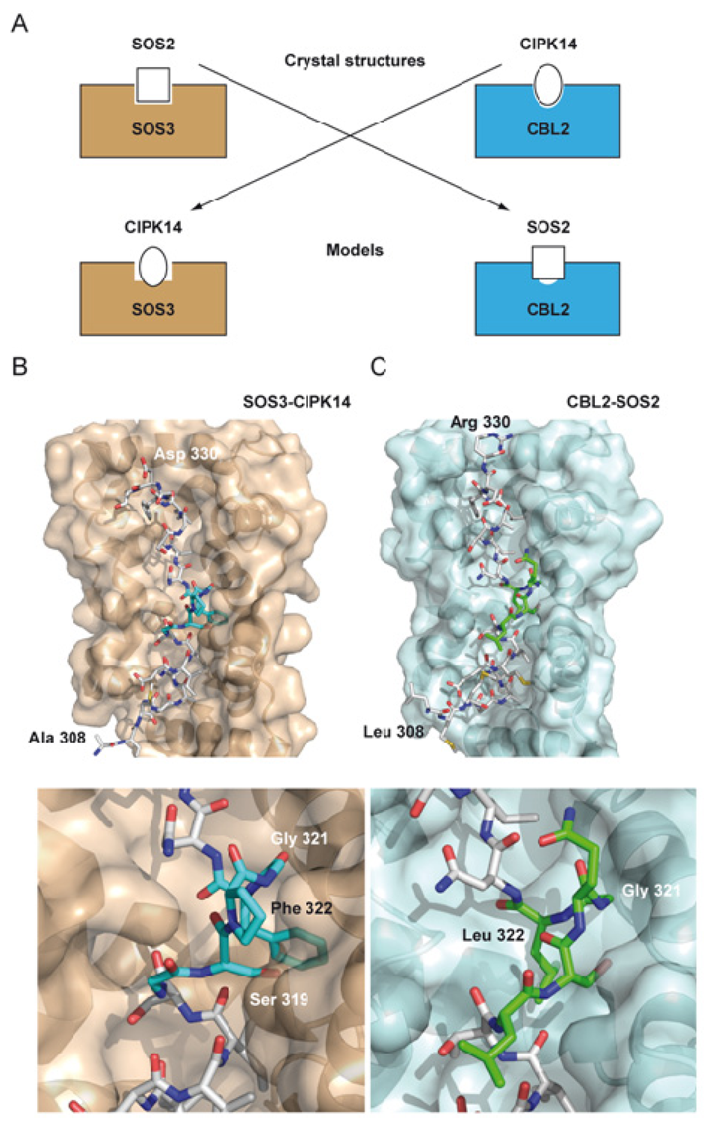 The specificity of the CBL CIPK interaction. (A) Schematic representation of the modeled complexes. The CIPK14 FISL moiety is inserted into the SOS3 cavity (B) and the SOS2 FISL is inserted into the CBL2 cavity (C). The lower part of the B and C panels represent a zoomed area of the FISL internal loop. SOS3 and CBL2 are displayed as a semitransparent molecular surface. The FISL motives are shown is a stick mode. Those residues form FISL overlapping CBLs are labeled.
