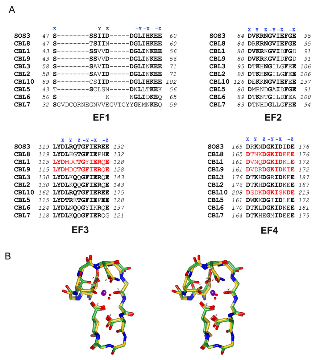 The Ca2+ binding EF hands of CBLs. (A) Sequence alignment of the AtCBL EF hands. Canonical EF hands are shown in red and residues involved in Ca2+ binding are highlighted by X, Y, Z, -X, -Y, -Z according to a classical EF hand. (B) Stereo view of the superimposition of a classical EF hand Ca2+ binding loop (EF-2 of CnB, PDB code 1AUI) and SOS3 EF-4 (PDB code 1V1G).