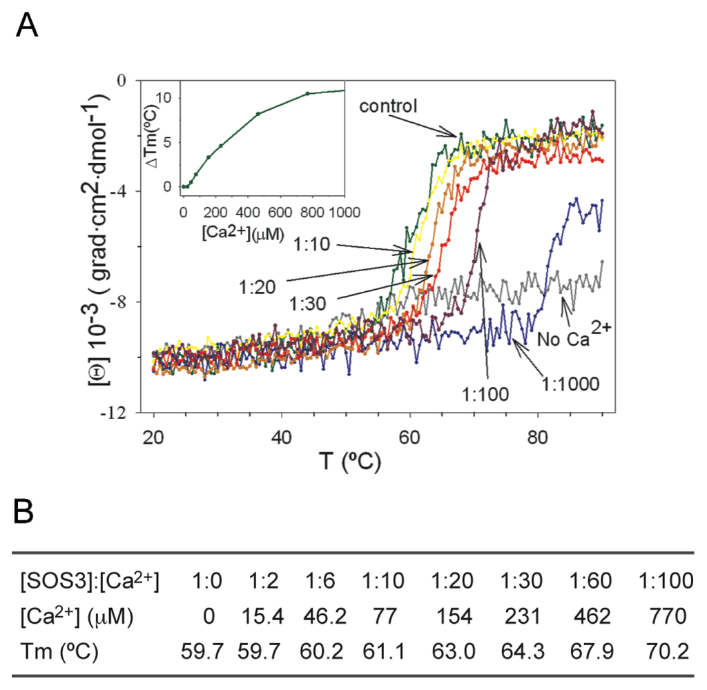 The Ca2+ affinity of SOS3. (A) Circular dichroism denaturation profiles of SOS3 as a function of Ca2+ concentrations. The SOS3: Ca2+ ratio ([SOS3]:[Ca2+]) is the molar ratio between protein and Ca2+ in the solution. Data are referred to [SOS3] = 7.7106 M. EDTA-dialyzed protein sample is labeled as “No Ca2+”. Inset and (B): Variation of the Tm (Δ Tm = Tm for a given concentration menus Tm of the control sample) with respect to the Ca2+ concentration.