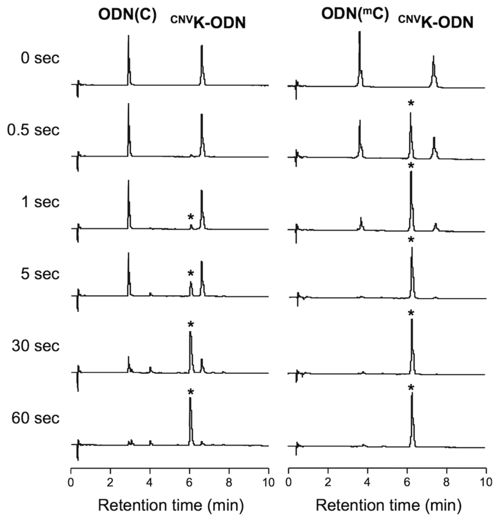 UPLC analysis of the photocrosslinking reaction between CNVK-ODN and ODN (C) (left) or ODN (mC) (right). [CNVK-ODN] = [ODN(C) or (mC)] = 5 μM in 50 mM Na-Cacodylate buffer (pH 7.4) containing 100 mM NaCl. Photoirradiation (366 nm) was performed at 20 °C. Asterisks indicate peaks identical to the photocrosslinked duplexes.