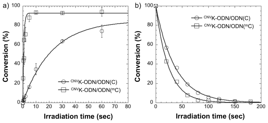 (a) Time course of the photocrosslinking reaction between CNVK-ODN and ODN(C) or ODN (mC) with 366 nm irradiation. [CNVK-ODN] = [ODN(C) or (mC)] = 5 μM in 50 mM Na-Cacodylate buffer (pH 7.4) containing 100 mM NaCl. Photoirradiation (366 nm) was performed at 20 °C; (b) Time course of the photosplitting reaction of the crosslinked duplexes consist of CNVK-ODN and ODN(C) or ODN(mC) with 312 nm irradiation. [Duplex] = 5 μM in 50 mM Na-Cacodylate buffer (pH 7.4) containing 100 mM NaCl. Photoirradiation (312 nm) was performed at 60 °C.