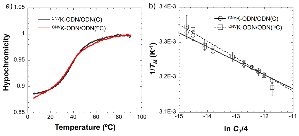 (a) UV melting curves of the duplexes consist of CNVK-ODN and ODN(C) or ODN(mC). [duplex] = 10 μM in 50 mM Na-cacodylate buffer (pH 7.4) containing 100 mM NaCl. Absorbance was monitored at 260 nm; (b) 1/TMvs. ln(CT/4) plots of the hybridization between CNVK-ODN and ODN(C) or ODN(mC).
