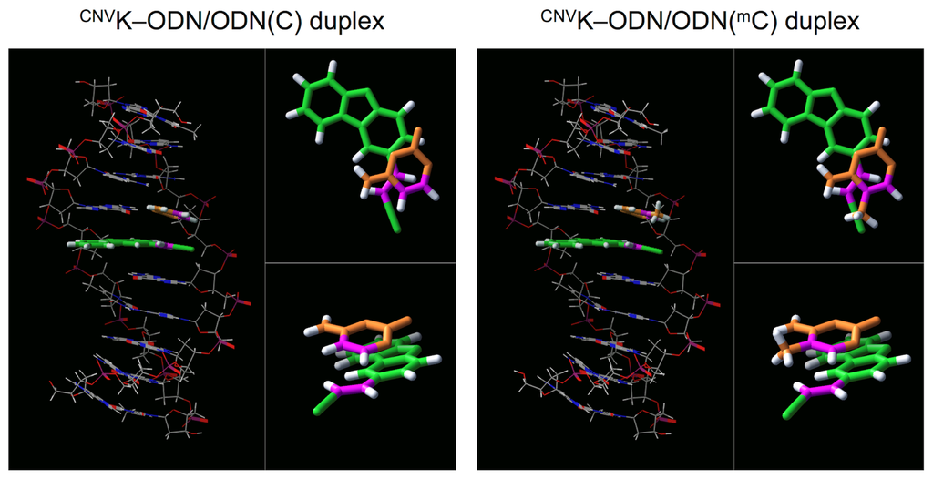 (a) Predicted structure of CNVK-ODN/ODN(C) duplex; (b) Predicted structure of CNVK-ODN/ODN(mC) duplex. These structures were calculated by MacroModel ver. 8.1 with Amber* force field.