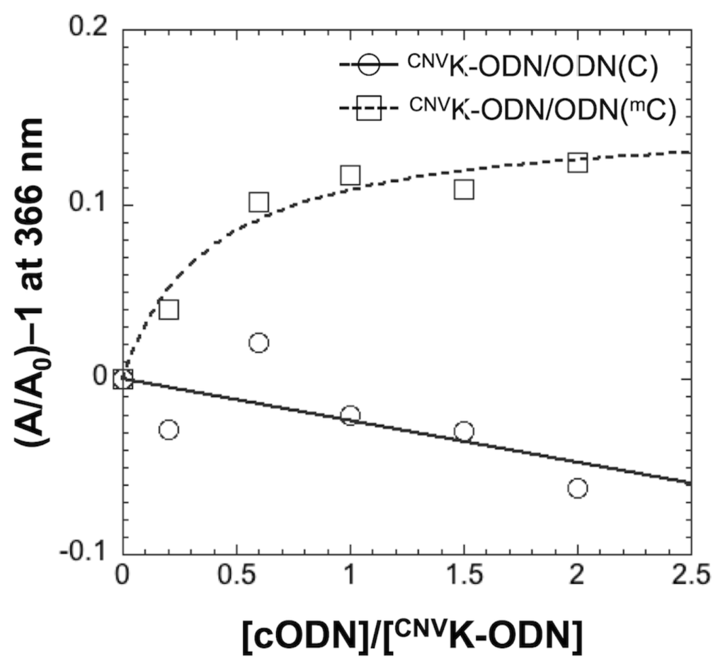 UV titration analysis of ODN(C) and ODN(mC) to CNVK-ODN. Absorbance was monitored at 366 nm. [CNVK-ODN] = 6 μM in 50 mM Na-Cacodylate buffer (pH 7.4) containing 100 mM NaCl. Experiments were performed at 20 °C.