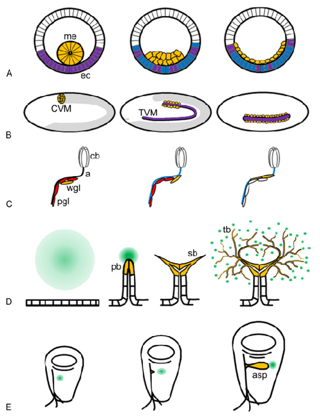 Developmental functions of FGF signalling in Drosophila. Diagram of morphogenetic events regulated by FGF signalling. FGFR (Htl or Btl) expressing cells are coloured orange, while expression of FGF ligands is indicated with separate colours: Bnl green, Pyr red, Ths blue, Pyr+Ths purple. (A–C) show Htl-dependent and (D–E) Btl-dependent multi-step developmental processes. (A) Schematic representation of cross sections of embryos during mesoderm layer formation illustrating tube stage, flattening and layer formation (me—mesoderm, ec—ectoderm). (B) Caudal visceral mesoderm (CVM) cell migration is drawn as longitudinal sections of the embryo. Posterior mesoderm cells migrate along the trunk visceral mesoderm (TVM) to form the progenitors of the longitudinal gut muscle. (C) Glial development in the eye imaginal disc: Glia cells migrate along the perineural glia sheet, once glia-axon contact is formed, glial wrapping commences (pgl—perineurial glia, wgl—wrapping glia, cb—cell body, a—axon). (D) Diagram of trachea development showing primary branch budding, secondary branch formation and ramification of terminal cells according to the oxygen need of the supplied cell (pb—primary branch, sb—secondary branch, tb—terminal branches). (E) Dorsal air sac forms from a tracheal branch that is associated with the wing imaginal disc (asp—air sac primordium).