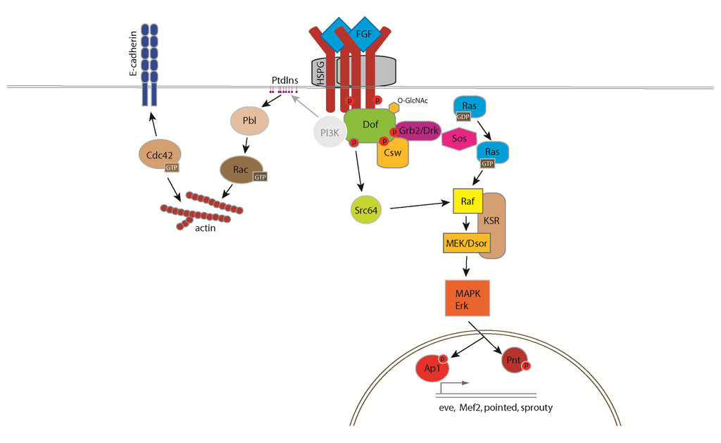 Schematic model of the FGF signalling cascade in Drosophila melanogaster. FGFs bind to their FGFRs and this interaction is stabilized by heparan sulfate proteoglycans (HSPG). Activation of the FGFR leads to auto- and trans-phosphorylation of their tyrosine kinase domains and to phosphorylation of its adaptor protein Dof. Dof protein is O-GlcNAcylated (O-GlcNAc) and possesses multiple clusters of tyrosine residues directing the signal towards various cascades, three of which—the Csw/Shp2, Grb2/Drk and Src64B pathways—have been proposed to contribute to MAPK activation. This route of FGF signalling is responsible for inducing gene transcription, and executing proliferative and anti-apoptotic responses. Dof also contains a putative binding site for PI3K that could locally modify the phosphatidylinositol (PtdIns) composition of the plasma membrane and thus recruit downstream signalling components for example the RhoGEF Pbl. Pbl acts on the Rac pathway to promote the formation of actin rich protrusions in the mesoderm. Actin polymerisation is required for protrusion formation in a Rac-, Cdc42- and FGF-dependent fashion. Putative interactions are indicated as grey arrows and the putative component of the Drosophila FGF pathway, PI3K, is represented as a circle with no border.