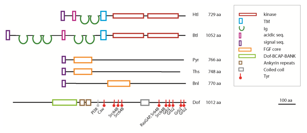 - Csiszar, A.; Vogelsang, E.; Beug, H.; Leptin, M. A novel conserved phosphotyrosine motif in the drosophila fibroblast growth factor signaling adaptor dof with a redundant role in signal transmission. Mol. Cell Biol 2010, 30, 2017–2027. [Google Scholar]