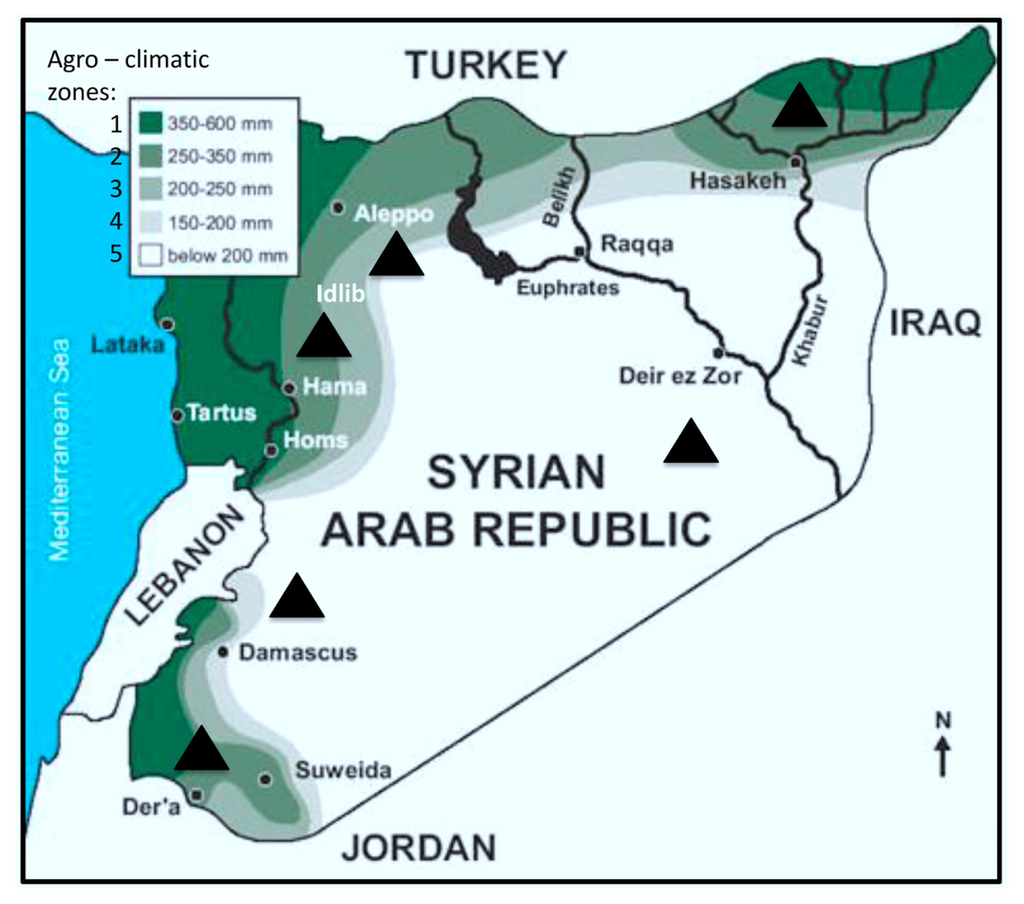 - SYRIA: Wheat Production in 2008/09 Declines Owing to Season-Long Drought. Available online: http://www.pecad.fas.usda.gov/highlights/2008/05/Syria_may2008.htm accessed on 9 May 2008.