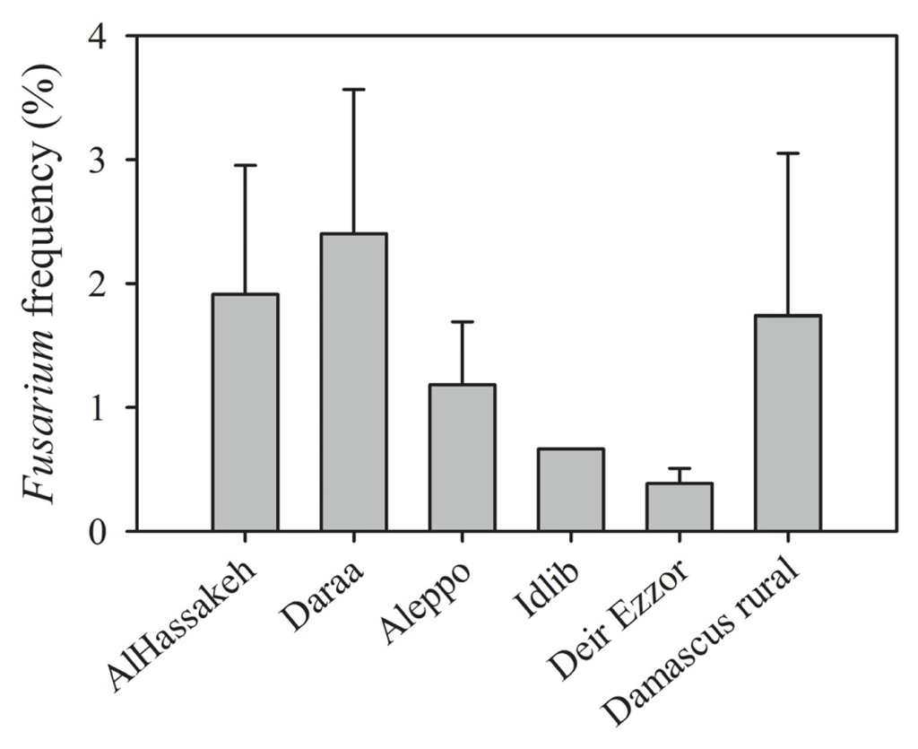 Fusarium spp. was present in 62.5% of all samples (Table 2) with a frequency of 2.4% (minimum 0.25%, maximum 25%). Fusarium species were mostly isolated from samples collected in the Daraa (agro-climatic zone 1, 2 and 3) and Al-Hassakeh (on the border between agro-climatic zones 1 and 2) areas, with frequencies of 2.4% and 1.9%, respectively, while the lowest relative frequency (0.4%) was in Deir Ezzor, a very dry region (agro-climatic zone 5; Figure 3). The differences in the incidence of Fusarium spp. among provinces can likely be accounted for by differences in their climate.