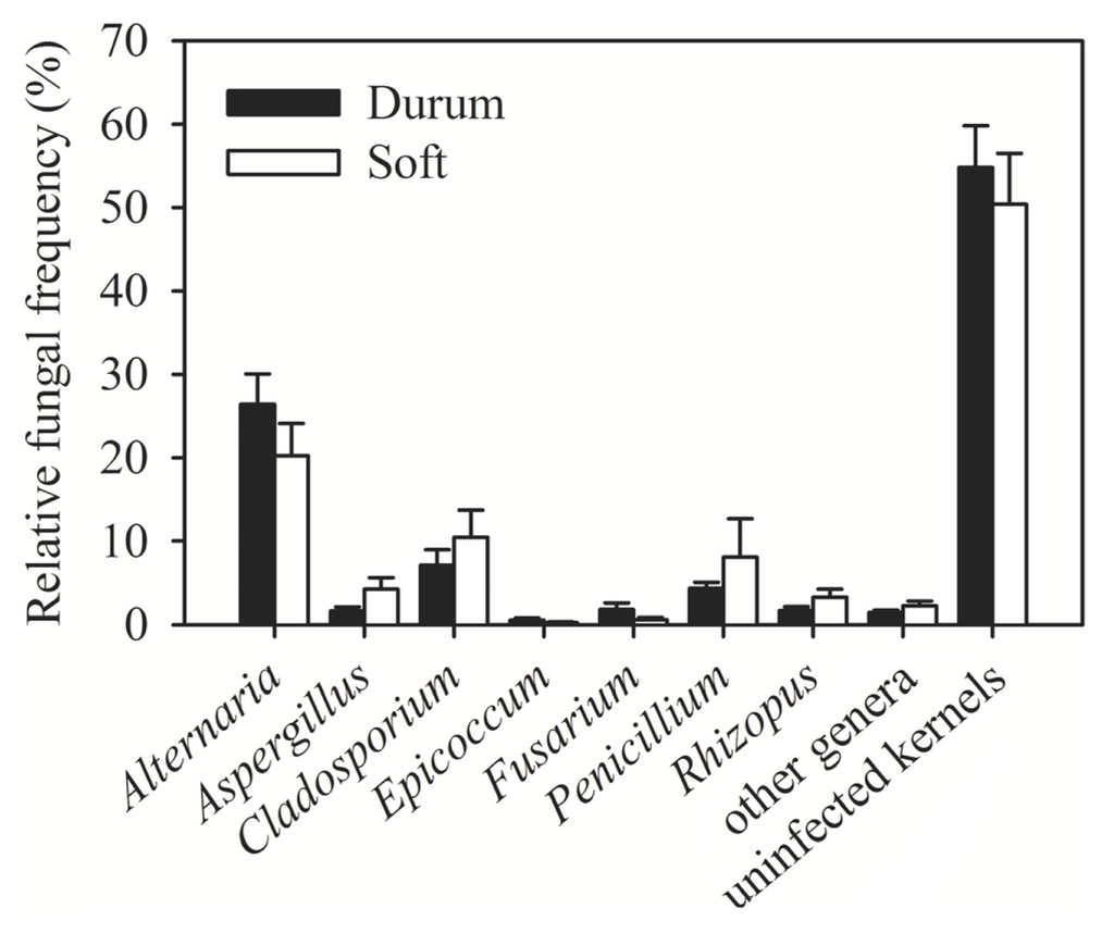 Promising sources of resistance to FHB have recently been identified in Syrian durum landraces [,]. Because durum wheat is more susceptible to FHB than soft wheat [], we compared the incidence of Fusarium spp. in durum and soft wheat cultivars in Syria (Figure 4). Durum wheat was more often colonized by Fusarium spp. (frequency 2%) than soft wheat (frequency 1%). Colonization rates of durum and soft wheat cultivars by other fungal genera were comparable; the total colonization rates by all fungi were similar, too (Figure 4).